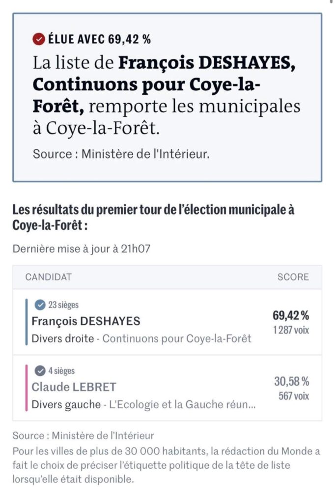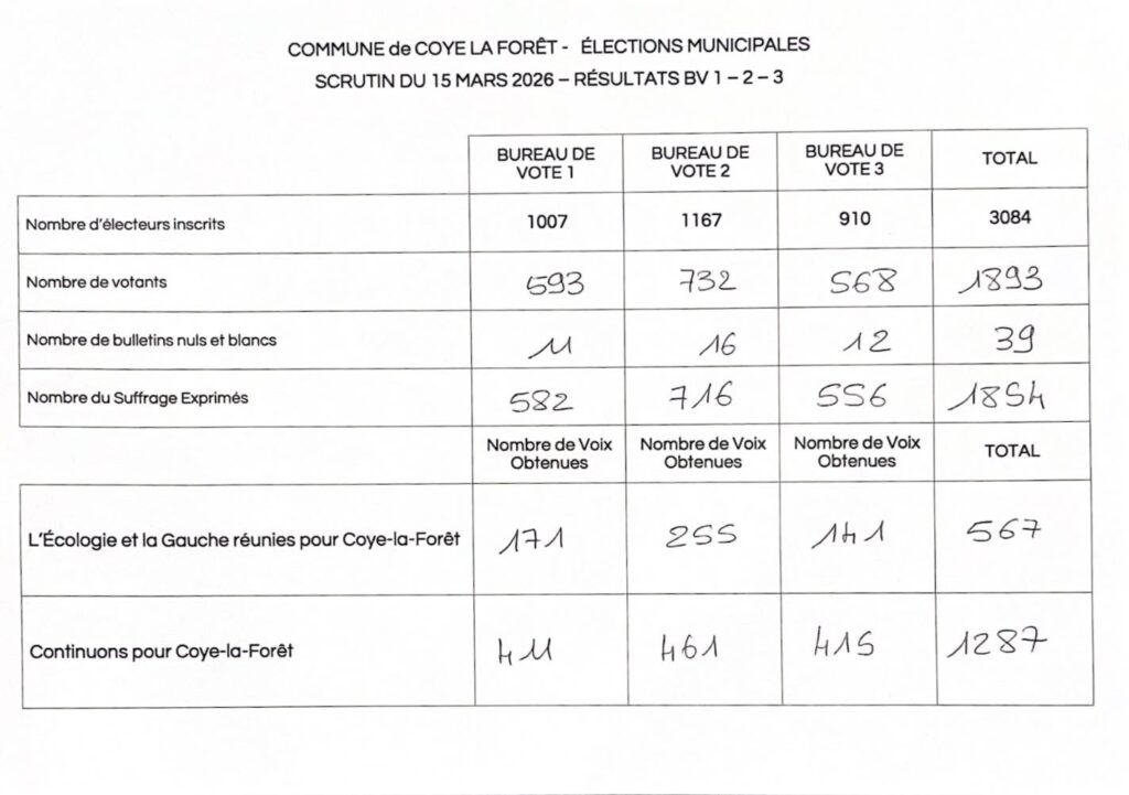 Accueil Vie de la commune Résultats élections municipales 2026 16 mars 2026 dans Municipal Vous trouverez ci-joint les résultats par bureaux et le document officiel du Ministère de l’Intérieur. Partager sur...